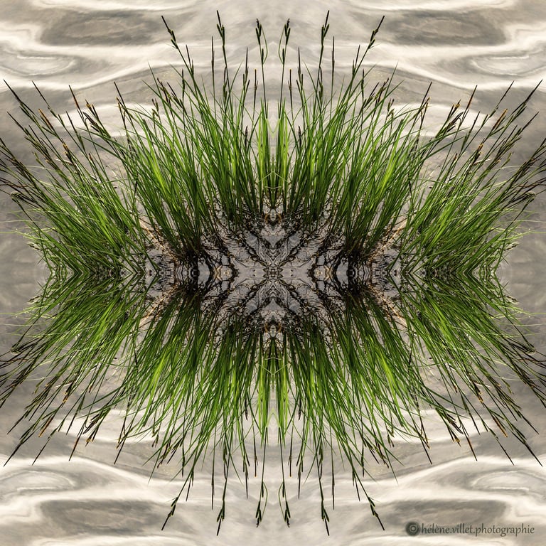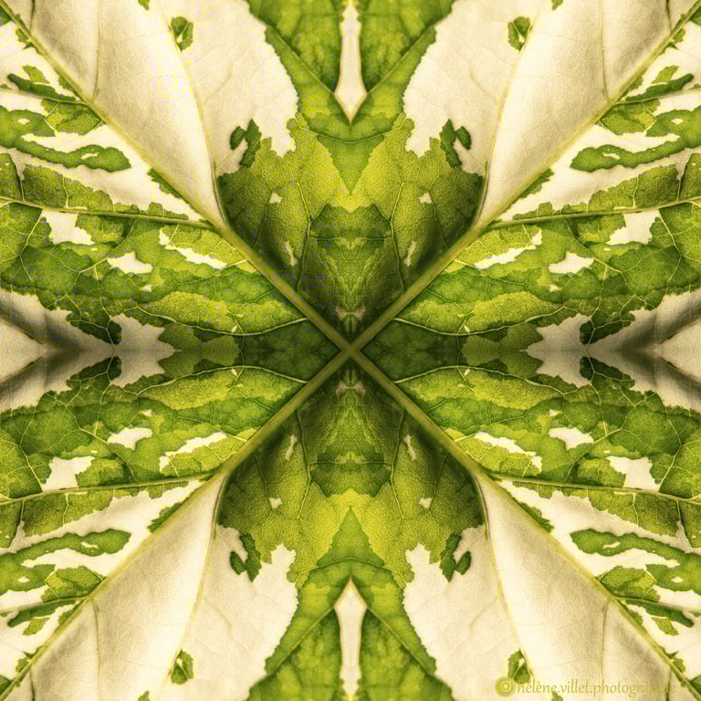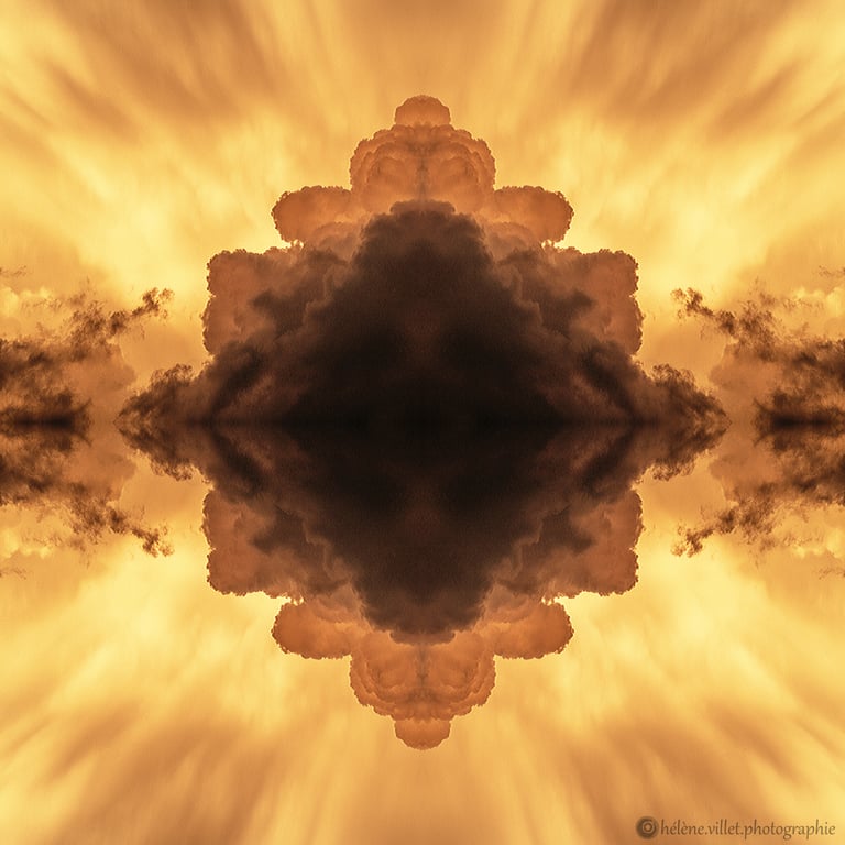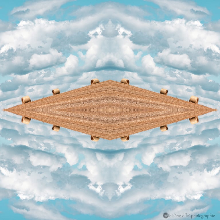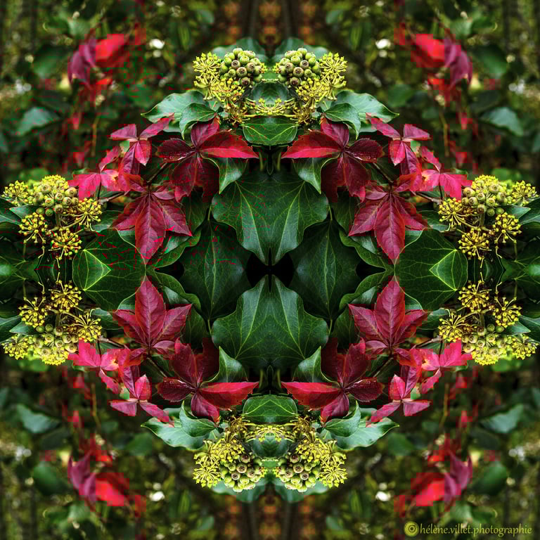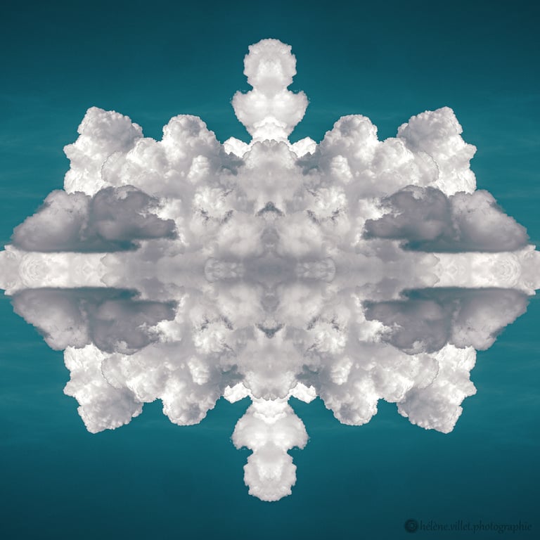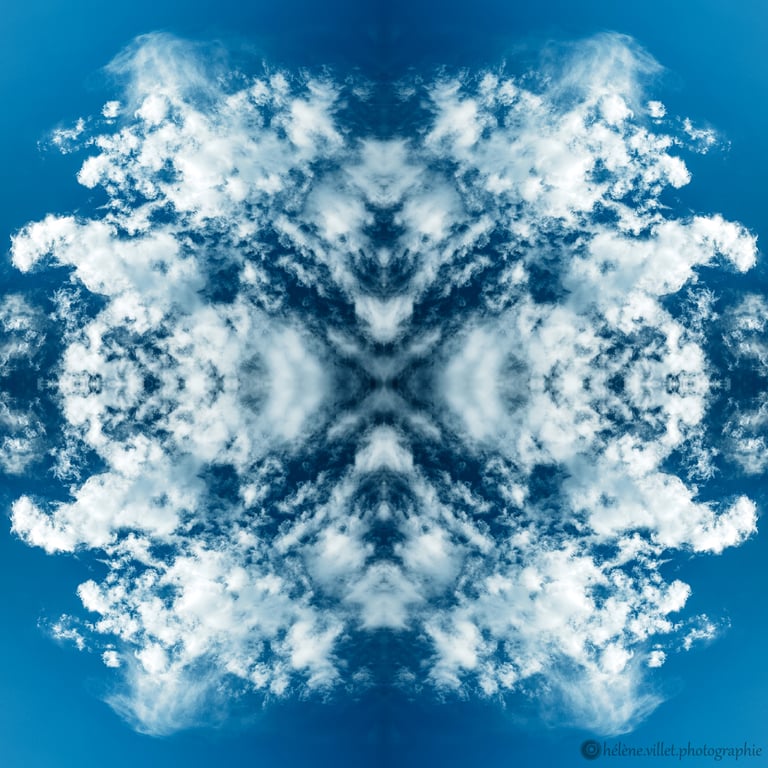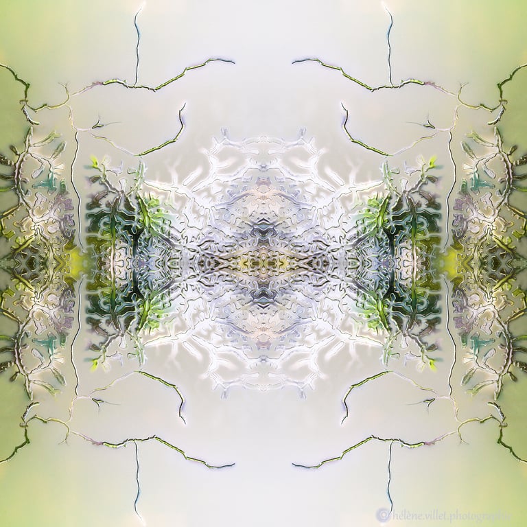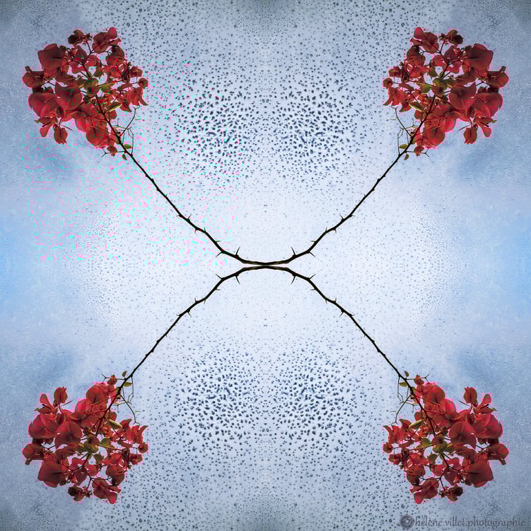 J’ai toujours aimé regarder la lumière du soleil au travers de ce tube en carton que ma main tournait pour que les petits fragments de verre coloré se réarrangent sans cesse en un jeu magique de symétries changeantes. Et un beau matin, j’ai joué à faire la même chose avec certaines de mes photographies carrées, et les ai disposées en miroir comme dans mon kaléidoscope d’enfant. La joie a été presque la même : voir se former de nouvelles figures parfois monstrueuses, parfois drôles ; y chercher des visages, des références familières.